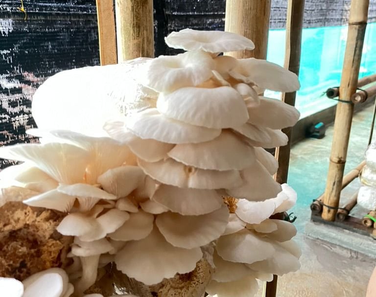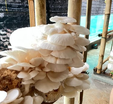 We grow chemical‑free Pleurotus ostreatus on recycled agricultural waste, turning sawdust and rice byproducts into nutrient‑rich substrate.
